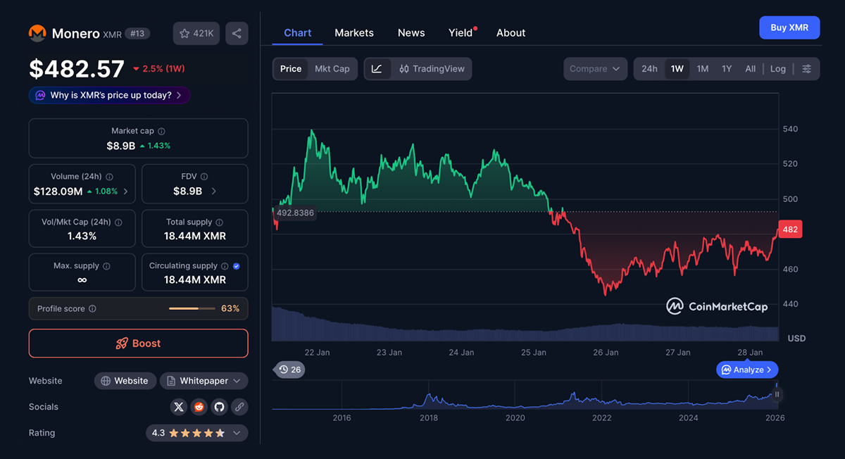 The Monero price chart was one of the more impressive spectacles in the second half of 2025. Although the Monero price did not keep pace with Zcash, it still performed strongly. In 2026, Monero continued to rally even as Zcash crashed after briefly trading above $700. A pullback now appears to be underway, with XMR changing hands below $500. Fortunately for Monero holders, price action looks more constructive than Dash and Dusk, with support forming near $480. A move back above $500 could shift the chart bullish again.