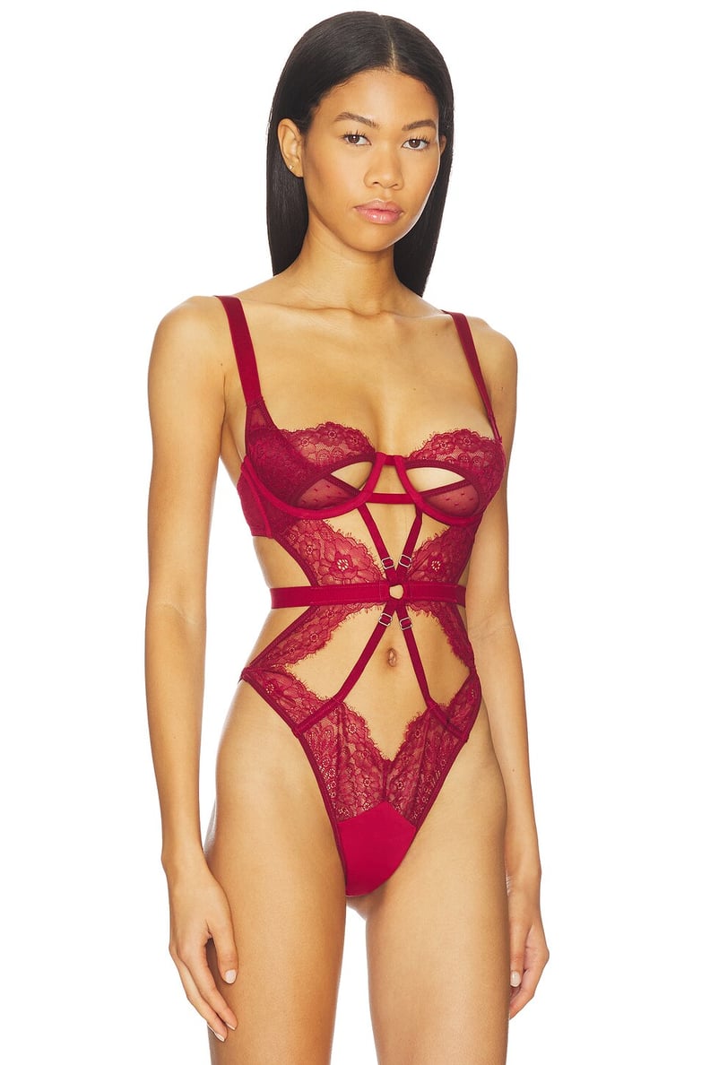 This mesh cutout bodysuit features delicate floral embroidery, adjustable straps, and a couple of adorably-placed mini rosebud bows. It has a G-string back and underwire at the bust, but no padding. Wear it underneath a cozy robe or with a pair of sweats, depending on the type of evening you're having.